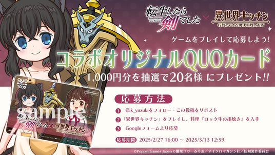 ポッピンゲームズジャパン株式会社が開発する、Android/iOS向け完全新作スマートフォンゲーム『異世界キッチン 行列のできる現代料理のお店』は、TVアニメ『転生したら剣でした』とのコラボイベント開催を記念して、公式X(旧Twitter)アカウントにて、2月27日(木)より「ゲームをプレイして応募!オリジナルQUOカードプレゼントキャンペーン」を開催いたします。