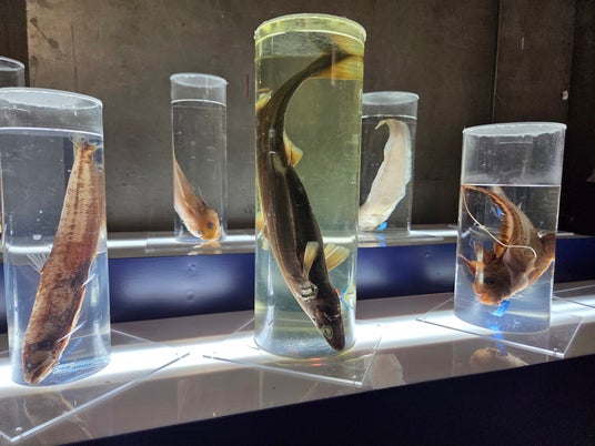 駿河湾で収集されたサメの顎の骨格標本やラブカ(胎児)の液浸標本