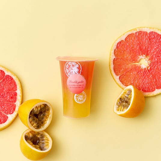 レッドグレープフルーツジュレとパッションフルーツジュレの二層仕立て。レッドグレープフルーツの果肉入りの、すっきりとみずみずしい味わい。