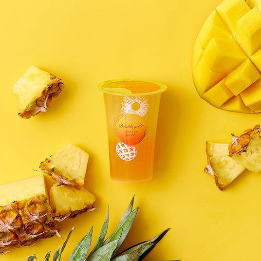 パイナップルジュレとマンゴージュレの二層仕立て。パイナップルの果肉入りの、夏らしいトロピカルな味わい。