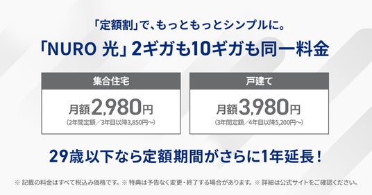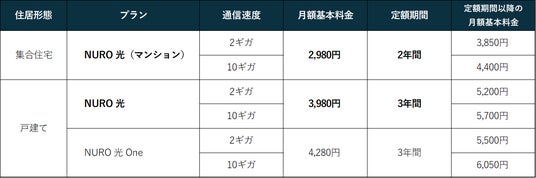 - 公式サイトから新規で「NURO 光」を申し込んだ方を対象に、集合住宅向けプラン「NURO 光 (マンション)」の月額基本料金が2年間定額、戸建て向けプラン「NURO 光(3年契約)」および「NURO 光 One」が3年間定額で利用可能。