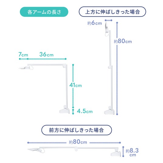 上アーム360mm、下アーム410mmの3関節設計により、照らしたい場所へ自在にアプローチ可能。角度や高さの微調整もスムーズで、作業姿勢に合わせて快適に使用できます。