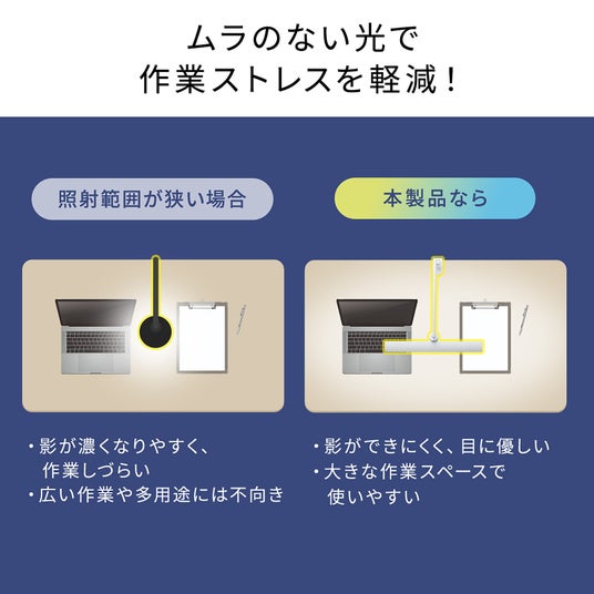 45.1cmのワイドLEDが、手元から奥まで均一な光を届けます。まぶしさを抑えたやさしい光で目にもやさしく、書類作業や読書、デジタル作業など、あらゆるワークスタイルに対応します。