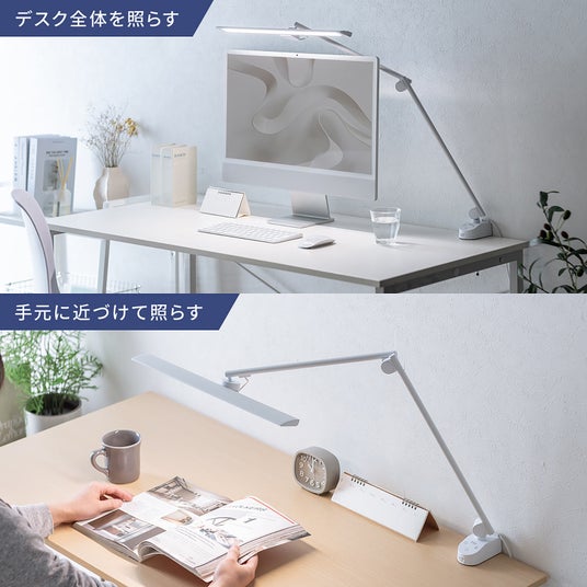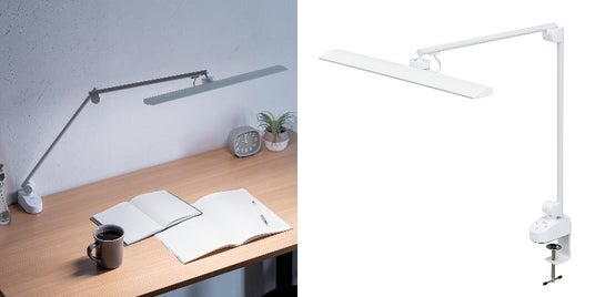 幅約45cmの広範囲照射と3関節アームで自在な位置調整ができるクランプ固定式のLEDデスクライト