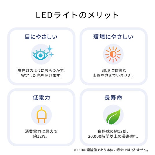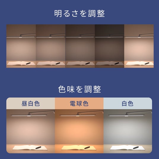 昼白色・電球色・白色の3色切替に加え、長押しで無段階、短押しで4段階の調光機能を搭載。リラックスタイムには柔らかい光、集中作業には明るくクリアな光と、シーンに最適な明るさを簡単に選べます。