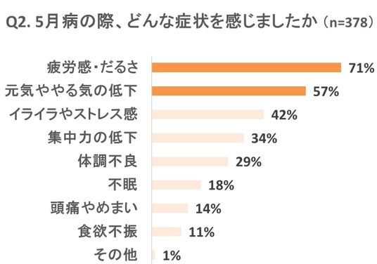 ・5月病を経験したことがある人に症状を聞くと、71%が「疲労感・だるさ」、57%が「元気ややる気の低下」と回答(Q2)。84%が日常生活(仕事や家事など)に影響があると回答しました(Q3)。