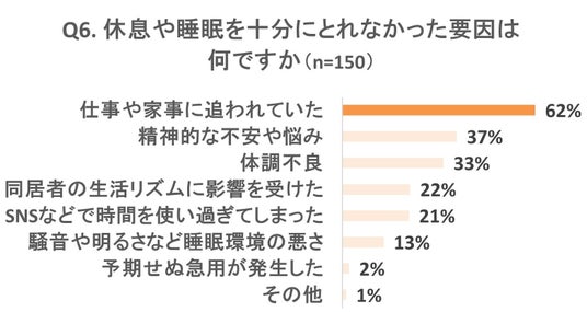・休息や睡眠を十分にとれなかった理由を聞くと、最も多い62%が「仕事や家事に追われていた」(Q6)。