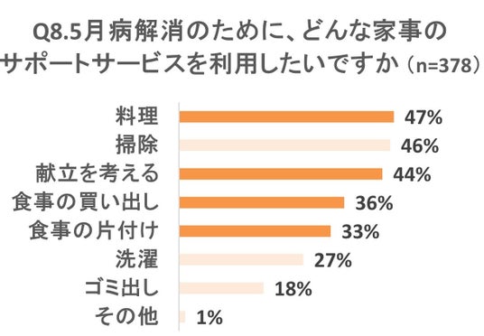 5月病を経験したことがあると回答した人に、5月病解消のために家事をサポートするサービスを利用したいか聞くと、50%が「利用したい」と回答(Q7)。具体的にどんな家事のサポートサービスを利用したいか尋ねると、47%が「料理」、44%が「献立を考える」、36%が「食事の買い出し」、33%が「食事の片付け」と回答し、食事にまつわるサポートサービスに回答が集まりました(Q8)。