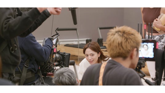 今回の撮影場所は実際のLAVAのスタジオ。ブランドカラーであるオレンジに、ブルーの差し色が入った華やかな衣装で登場した川口さん。お客様役の出演者と会話を楽しみながら、順調に撮影は進みました。ヨガポーズの撮影では、ポーズを入念に練習する真剣な様子や、日差しの入る明るいスタジオでリラックスしている様子が見られました。休憩中は、同スタジオ内のマシンピラティスのマシン(リフォーマー)に興味を示されるシーンも。川口さんのやさしげな雰囲気に、終始和やかなムードで撮影を終えました。