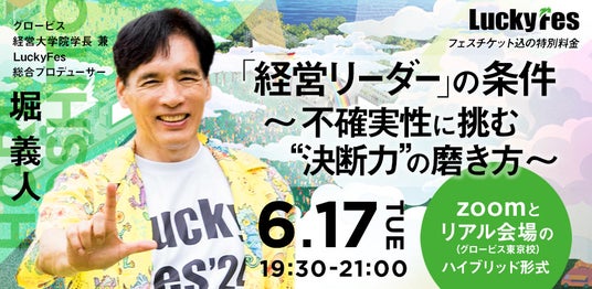 さらに6月17日(火)18時より、堀義人との夕食付き特別プライベートセッションをグロービス 東京会議室で開催します。昨年、 個人協賛でLuckyFesにご参加いただいた三井住友フィナンシャルグループ 磯和啓雄氏をお招きし、 エンタメビジネスの真骨頂やLuckyFesの魅力について迫ります。個人協賛者特別エリアでの参加を検討される方は、 お申込みください。