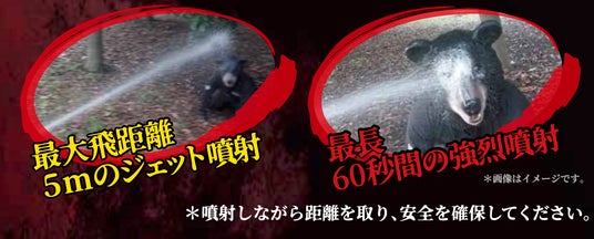 ●約60秒間ジェット噴射し驚きを与えると同時にとても不味い成分が口や鼻に入り込み強烈な嫌悪感を与え闘争心を瞬時に減退させます。眼/口腔/鼻腔内部に段階的に入り込み、視覚を中心に熊の行動力を奪います。