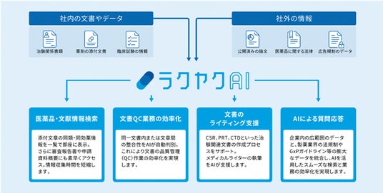 製薬業界に特化した専門文章AIサービス「ラクヤクAI」SaaS版として、社内のナレッジ情報や医薬品・文献情報の検索、文書品質管理業務の効率化、生成AIによるライティング支援や質疑応答まで幅広いラインナップを取り揃え、各社専用のセキュアな環境下でより多くのお客様にご利用いただける運びとなりました。