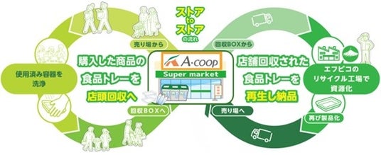 株式会社エフピコ(代表取締役会長:佐藤 守正、以下「エフピコ」)とJA全農Aコープ株式会社(代表取締役社長:宗村 達夫、以下「Aコープ」)は協働し、東日本エリア(神奈川、群馬エリア)の28店舗において、現在進めている店舗で回収された使用済み食品トレー及び使用済みペットボトルを新たな食品トレー・透明容器に生まれ変わらせ、再びお店で使用する「ストアtoストア」の水平リサイクルを促進する取り組みを、更に拡大いたします。