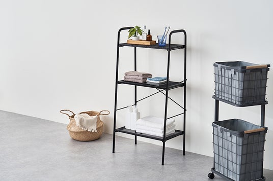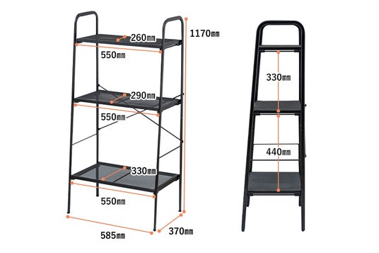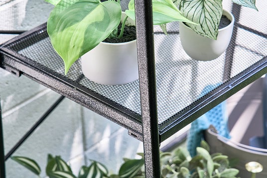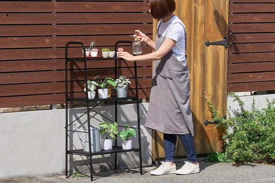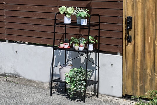 エンボス塗装したシンプルなラックは、どんなテイストにも馴染むデザインが特長。庭置きはもちろん、室内ではシェルフとしても活用できます。植物も小物もたっぷり置ける3段ラックは、収納棚としても便利。