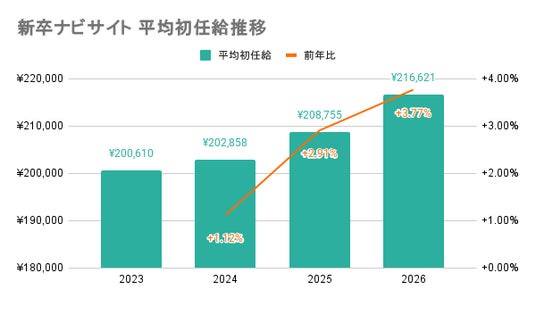 続いて新卒ナビサイトでの平均初任給を見てみると、前年比の伸び率が毎年上がっており、各社で初任給を引き上げている様子がうかがえます。26卒の平均初任給は、25卒から3.77%(7,866円)増加して216,621円となり、21万円台に突入しました。