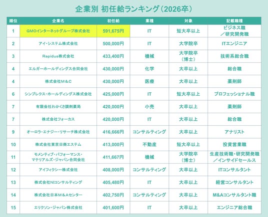 26卒の初任給最高額は、GMOインターネットグループ株式会社の591,675円【2025年3月度 26卒ナビサイト 初任給レポート】