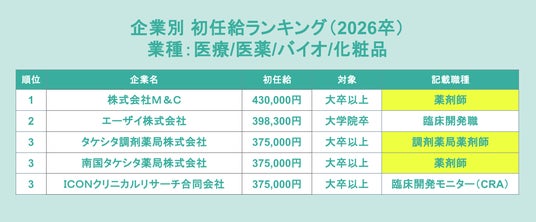 1位の医療系業種における26卒の初任給を企業別に調査してみると、「株式会社M&C」が430,000円で最高額となっています。次いで「エーザイ株式会社」が398,300円、「タケシタ調剤薬局株式会社」と「南国タケシタ薬局株式会社」と「ICONクリニカルリサーチ合同会社」が375,000円と続きました。それぞれの記載職種を見てみると、5社中3社が薬剤師の募集となっています。