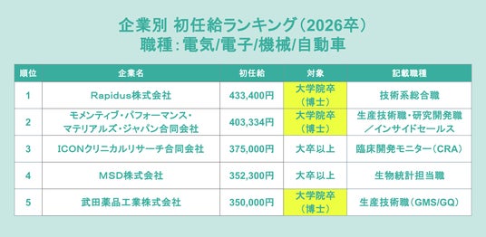 1位の電気・機械系職種における26卒の初任給を企業別に調査してみると、「Rapidus株式会社」が433,400円で最高額となっています。次いで「モメンティブ・パフォーマンス・マテリアルズ・ジャパン合同会社」が403,334円、「ICONクリニカルリサーチ合同会社」が375,000円、「MSD株式会社」が352,300円、「武田薬品工業株式会社」が350,000円と続きました。それぞれの対象学歴を見てみると、5社中3社が博士課程修了予定の学生に向けた給与水準となっています。