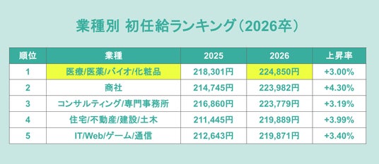 続いて、26卒における初任給を業種別のランキングで分析したところ、「医療/医薬/バイオ/化粧品」が224,850円で1位となりました。次に「商社」が223,982円、「コンサルティング/専門事務所」が223,779円、「住宅/不動産/建設/土木」が219,889円、「IT/Web/ゲーム/通信」が219,871円と続いています。