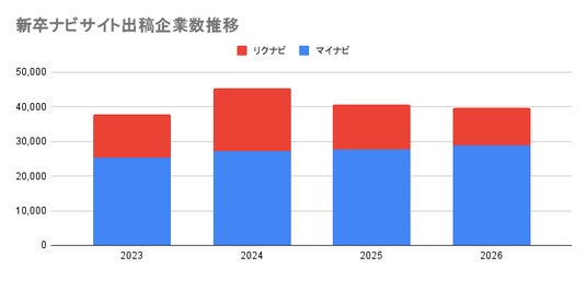 まずは、23卒のナビサイトから26卒までのナビサイトで、出稿企業数の推移を調査しました。24卒での増加を除くと、4万社前後でほぼ横ばいとなっています。ダイレクトリクルーティングなど他の採用手法が広まっていることも、企業数の増加が少ない要因の1つと言えそうです。