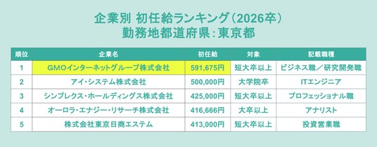 1位の東京都における26卒の初任給を企業別に調査してみると、「GMOインターネットグループ株式会社」が591,675円で最高額となっています。次いで「アイ・システム株式会社」が500,000円、「シンプレクス・ホールディングス株式会社」が425,000円、「オーロラ・エナジー・リサーチ株式会社」が416,666円、「株式会社東京日商エステム」が413,000円と続きました。