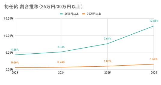 25万円以上は、4.38%から3年で8.47ポイント上昇し、12.85%となりました。特に25卒から26卒にかけてその割合が増えています。30万円以上は3年で0.66%から1.64%まで0.98ポイント上昇し、こちらも25卒から26卒にかけて特に増加しました。