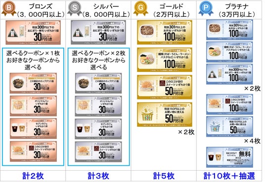 1.期間中の購買金額に応じて最大20枚1,320円分(税抜)のクーポンプレゼント2.プラチナランク達成でセブン‐イレブンオリジナルグッズが抽選で当たる