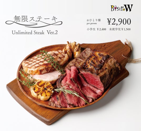 数多くの人気SNSインフルエンサーに取り上げられ話題となった、ビーフとポークのステーキ食べ放題「無限ステーキ」(税込2,900円)が、このたびバージョンアップいたします。