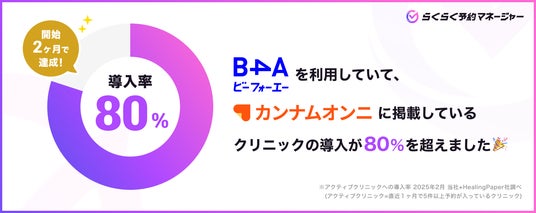 株式会社シアン(本社:東京都渋谷区、代表取 役:籔本 崇)が開発・提供する美容クリニック向けサイトコントローラー「らくらく予約マネージャー for 美容クリニック」は、業界シェアNo.1電子カルテB4A(ビーフォーエー)とカンナムオンニを利用中のクリニックへの導入率が販促開始からわずか2ヶ月で80%を突破しました。