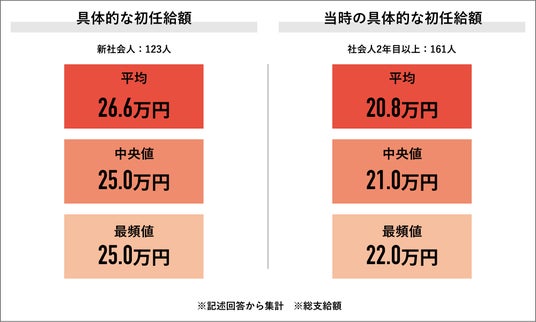 新社会人(2025年卒)の123人に具体的な初任給額を聞くと、平均額が26.6万円、中央値が25.0万円、最頻値が25.0万円となりました。社会人2年目以上の161人に当時の具体的な初任給額を聞くと、平均額が20.8万円、中央値が21.0万円、最頻値が22.0万円となりました。