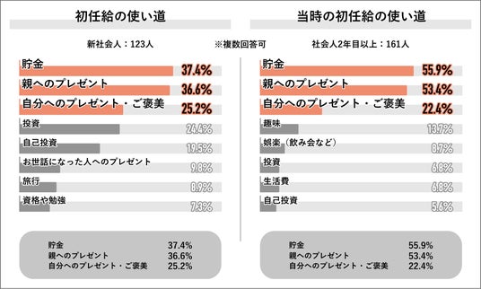 ・初任給の使い道は両者「貯金」「親・自分へのプレゼント」が上位も 割合にギャップ