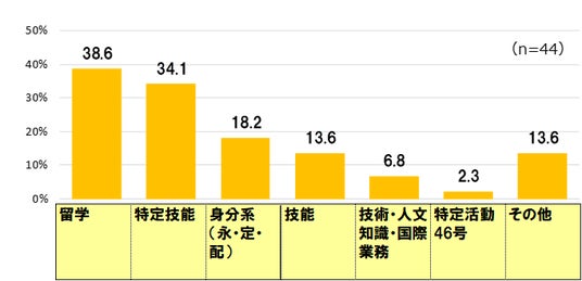 雇用している(または雇用していた)外国人労働者の在留資格をみると、「留学(38.6%)」と「特定技能(34.1%)」が特に高い結果となりました。