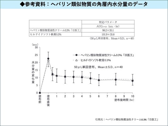 上述の内容は、ヘパリン類似物質油性クリーム0.3%「日医工」とヒルドイドソフト軟膏0.3%に関する水分量比較試験の結果です。いずれの製品も塗布後20分経過時点で、水分量16~17範囲のスコアと推定されます。