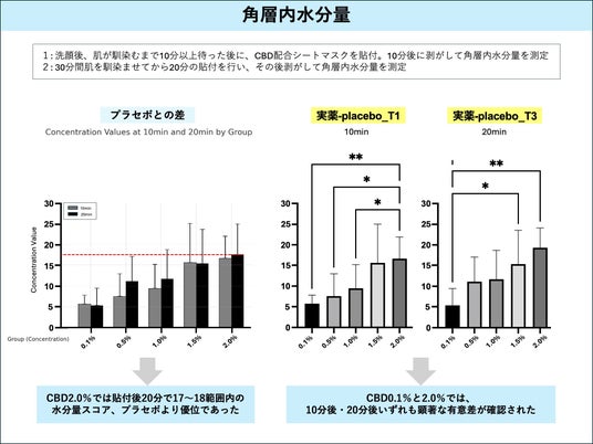 プラセボと比較した場合、CBD2.0%配合のマスクを20分間貼付した後では、水分量スコアが17~18程度の範囲で確認されました。また、貼付時間10分・20分いずれの場合も、CBD0.1%と2.0%では水分量スコアに明確な有意差が示されました。