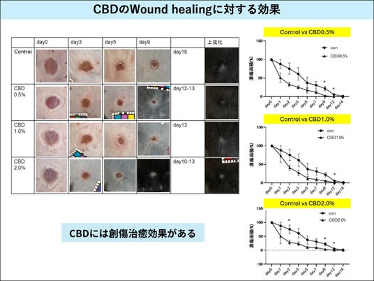マウスに6mmパンチを用いて潰瘍を作成し、基材ワセリンのCBD外用剤を毎日塗布して潰瘍面積を測定しました。コントロール群と比較した場合、CBDは塗布後1日目から潰瘍面積の縮小を示しました。特にCBD2.0%では、塗布9日目に著しい面積減少が観察され、発毛も確認されました。