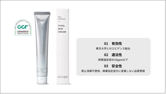 <東京大学CCRマーク>CCRマークは、東京大学大学院医学系研究科臨床カンナビノイド学講座の研究における、カンナビノイドの有効性・安全性の目印です。 このマークにより、有益かつ安全なカンナビノイド原料を使用していることを示しています。