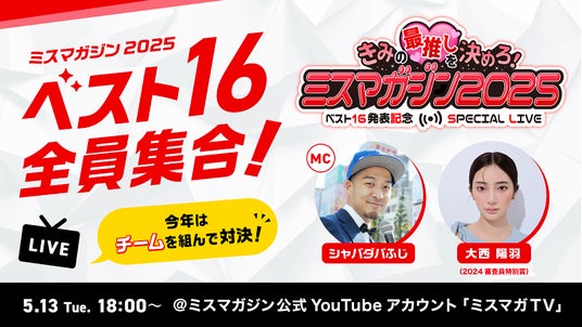 株式会社講談社は、「ミスマガジン2025」のセミファイナルに進出した16名を、2025年5月13日(火)に発表いたします。この発表を記念し、ベスト16全員が出演する「君の最推しを決めろ! ミスマガジン2025 ベスト16発表記念 YouTube Live」を、同日18時00分よりミスマガジン公式YouTubeアカウント「ミスマガTV」にて実施いたします。