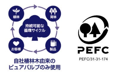 自社管理植林木を使用植林~パルプ~紙(製品)の大きなエコリサイクルを形成。ハローは自社が管理している植林木のみを材料としたピュアパルプ100%の製品です。自然木は一切伐採しておりません。私たちが植え、育て、製品を作る循環を繰り返すことで、地球温暖化の抑制に貢献する環境にやさしい製品を提供しています。また、国際的な認証制度を行う第三者機関のひとつであるPEFCの認証を受けています。