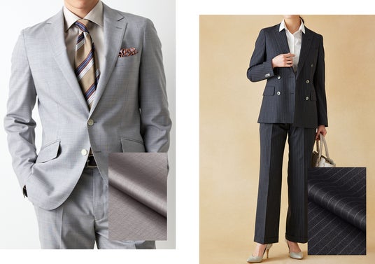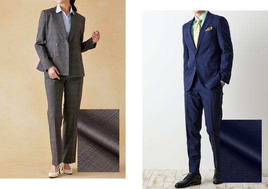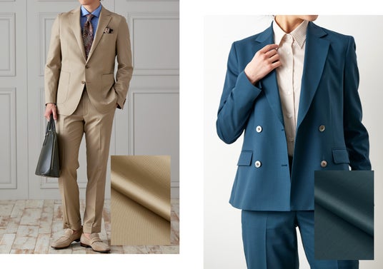 従来から人気の艶感ある素材に加え、夏の暑い時期に最適なドライタッチで防シワ性やストレッチ性に優れた素材は、出張や外回りの多いビジネスマンに適しています。特にスーツを持ち歩く際には芯地やパットが薄いアンコンモデルやカイザーレジェロが収納しやすく、ストレッチ性も備えているため夏に着用するパンツ素材としてもオススメです。