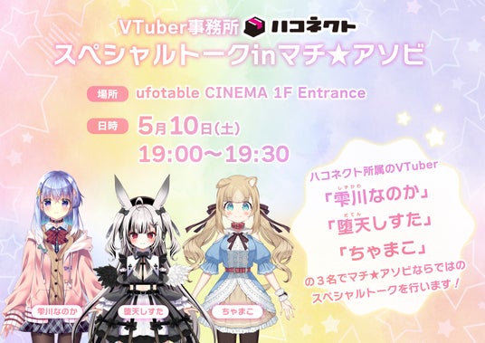 また5月10日(土)19:00より「ufotable CINEMA」1F,Entranceにて、ハコネクト所属のVTuber「雫川なのか」「堕天しすた」「ちゃまこ」の3名で、VTuber事務所「ハコネクト」スペシャルトークinマチ★アソビを行います!