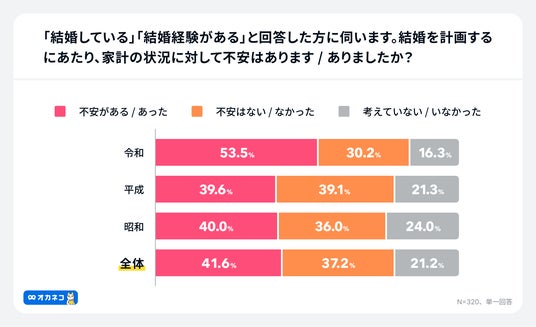 家計の不安:41.6%が不安。令和婚夫婦が最も高く、過半数が家計に不安