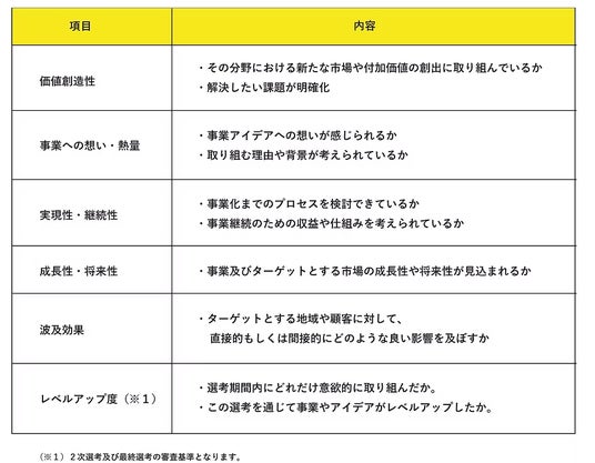 ・応募いただくビジネスプランが、公の秩序または善良の風俗を害しない、社会通念上適当と認められる事業であること。