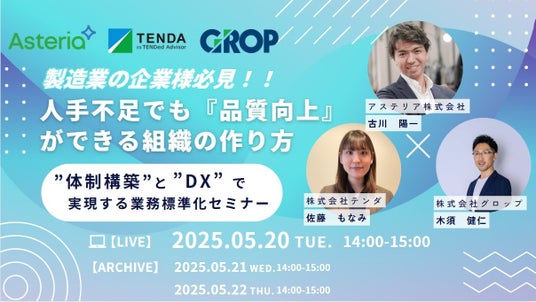 マニュアルトータルソリューションを軸に「ホワイトカラーの業務効率化」を推進する株式会社テンダ(本社/東京都渋谷区、代表取締役会長/小林 謙、以下「テンダ」)は、株式会社グロップ (本社/岡山県岡山市、代表取締役社長/原田 竜一郎、以下「グロップ」)およびアステリア株式会社(本社/東京都渋谷区、代表取締役社長/平野 洋一郎、以下「アステリア」)と、2025年5月20日(火)に「製造業の企業様必見!!人手不足でも『品質向上』ができる組織の作り方 ”体制構築”と”DX”で実現する業務標準化セミナー」と題し、共催ウェビナーを開催いたします。
