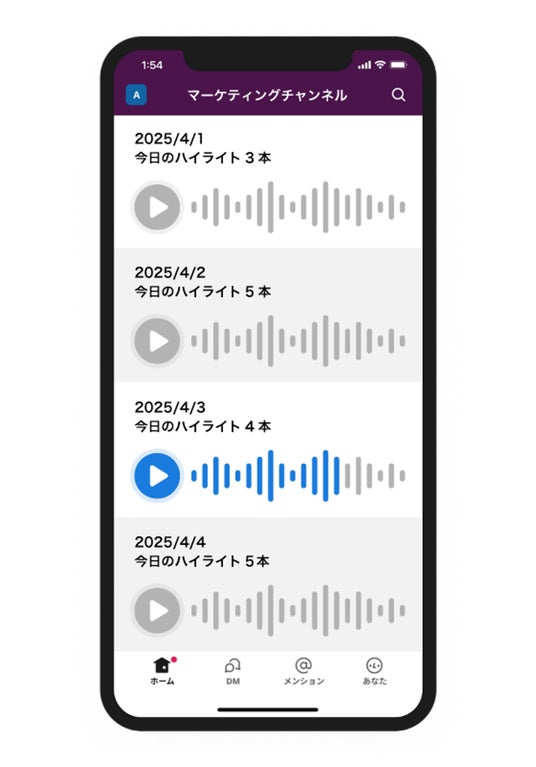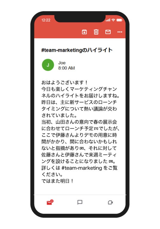 本サービスは、Slack上で同時多発的に交わされる様々な会話をもとに、テキストや音声形式でハイライトを生成し、メールやチャットなどマルチチャネルを通じて配信するサービスです。