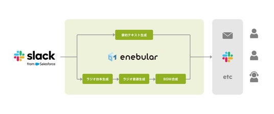 これを実現するため、Slackと自社開発のローコード開発プラットフォーム「enebular」を活用し、音声による情報配信を含むマルチチャネル対応のAI要約サービスの開発に着手しました。