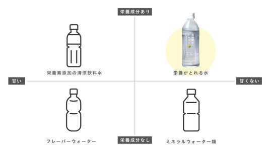 当社ではこれまで、ウォーター類を、1.天然水を使用したナチュラルミネラルウォーター、2.香りや風味を楽しむフレーバーウォーター、3.ビタミンCなどの栄養素を添加した清涼飲料水、の3つに分類してまいりました。このたび、お客様から「日常の水分補給のついでに栄養も”水で”摂りたい」「ニアウォーターは甘さが気になる」といったご要望を受け、糖やカロリーを気にせず栄養補給ができる“栄養がとれる水”という新たな領域に着目し、新商品を開発いたしました。