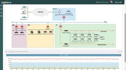 LogStare Collectorのリアルタイム監視画面。オンプレミスからクラウドまで様々なITシステムを監視できる