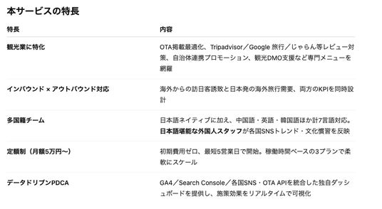 本サービスは、観光業に特化した知見と多国籍チームの実行力を活かし、月額定額でワンストップのマーケティング支援を提供します。