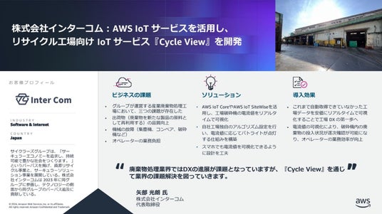 サーキュラーエコノミー(循環型経済)を追求し、持続可能で豊かな社会づくりを目指す、サイクラーズグループの中で、ソフトウェア開発やネットワーク構築を手掛ける、株式会社インターコム(本社:東京都府中市、代表 矢部 光朗、以下「当社」)は、2023年7月にグループに加わってから、廃棄物の現場課題をITで解決する工場DXの取り組みを進めてまいりました。その取り組みの中で、開発を進めておりました、AWS IoTサービスを活用した「リサイクル工場向けIoTサービス『Cycle View』」を5月1日(木)にローンチいたしました。