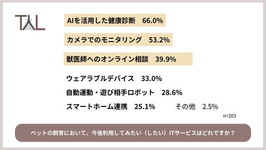 また、犬猫の飼い主203名に対し「ペットの飼育において、今後利用してみたい(今後も利用したい)ITサービスはどれですか?」と質問したところ、半数を超える飼い主が「AIを活用した健康診断」(66.0%)、「カメラでのモニタリング」(53.2%)を利用してみたいと回答しました。そのほかに「獣医師へのオンライン相談」(39.9%)や「ウェアラブルデバイス」(33.0%)にも注目が集まっていることが分かりました。